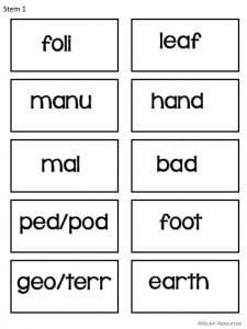 That same day, I introduce stem words using the “What is a Stem?” poster. We do one together, play the concentration game with just stem words, and find a word example for homework.