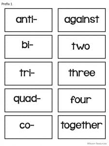 I hand out the study guide and use the “What is a Prefix” poster to reteach prefixes. I then have students look up words for anti- in class and we fill out a Word Web together on our smart board. I break the kids into groups and they play concentration with the prefix cards. For homework, I ask them to come up with one word for each of the prefixes and tell them to study all the prefixes.