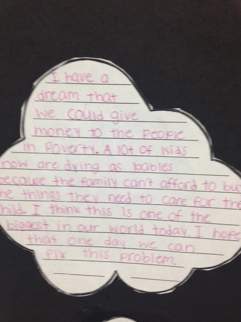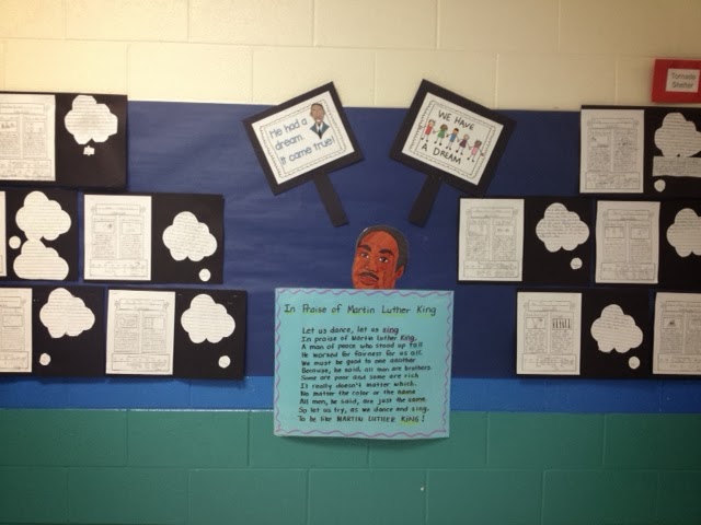 Since we were gone for two weeks and it is a new year, I wanted to put up a new bulletin board. I thought I would put up a Martin Luther King Jr. board. That way I can keep it up for the rest of January and it will tie into Black History Month. I was so amazed by some of my students and their work! How do these little minds come up with such big ideas?