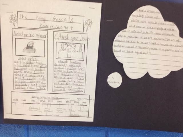 We started off by reading a biography on MLK. I actually wrote one to go along with the activity so the students would have enough information. We read it together then we started working on a newspaper template. We filled out the timeline together. I explained the importance of increments in timelines. Then we highlighted all the dates and added them to the timeline. I also showed them how to find dates that aren’t listed. For example where it says two years later. Then I explained that they will need to pretend they were reporters from back in the 1960’s. They need to choose 1 positive and 1 negative event from the bio. I demonstrate how to create a newspaper title, heading, picture caption, etc. and then I let them write! Here are some of their examples:
