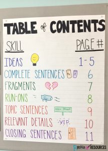 Start the table of contents on the first page. As students learn each mini lessons, they number their pages and keep track on the Table of Contents page! Students should copy from your table of contents made on chart paper.