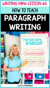 If you are looking for ideas to teach PARAGRAPH WRITING, you are in the right place! It is part of a STEP-BY-STEP WRITING® series of mini-lessons for writer’s workshop designed to scaffold through the writing process. Paragraph writing will extend through three posts (lessons 5 topic sentences, 6 relevant details, and 7 closing sentences). Now that your students are WRITING COMPLETE SENTENCES using the previous mini-lessons, they are ready to learn how to write a paragraph!