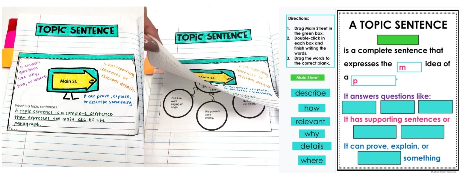 If using interactive notebooks, create something similar to the following. Students should take notes and give examples. This will provide them with an amazing reference to flip through when writing paragraphs in the future. When I walk around during a writing assignment and notice students who forgot to add a topic sentence, I remind them to use their notebooks. It works wonders! It is an effective tool to use in small groups and reteaching too.