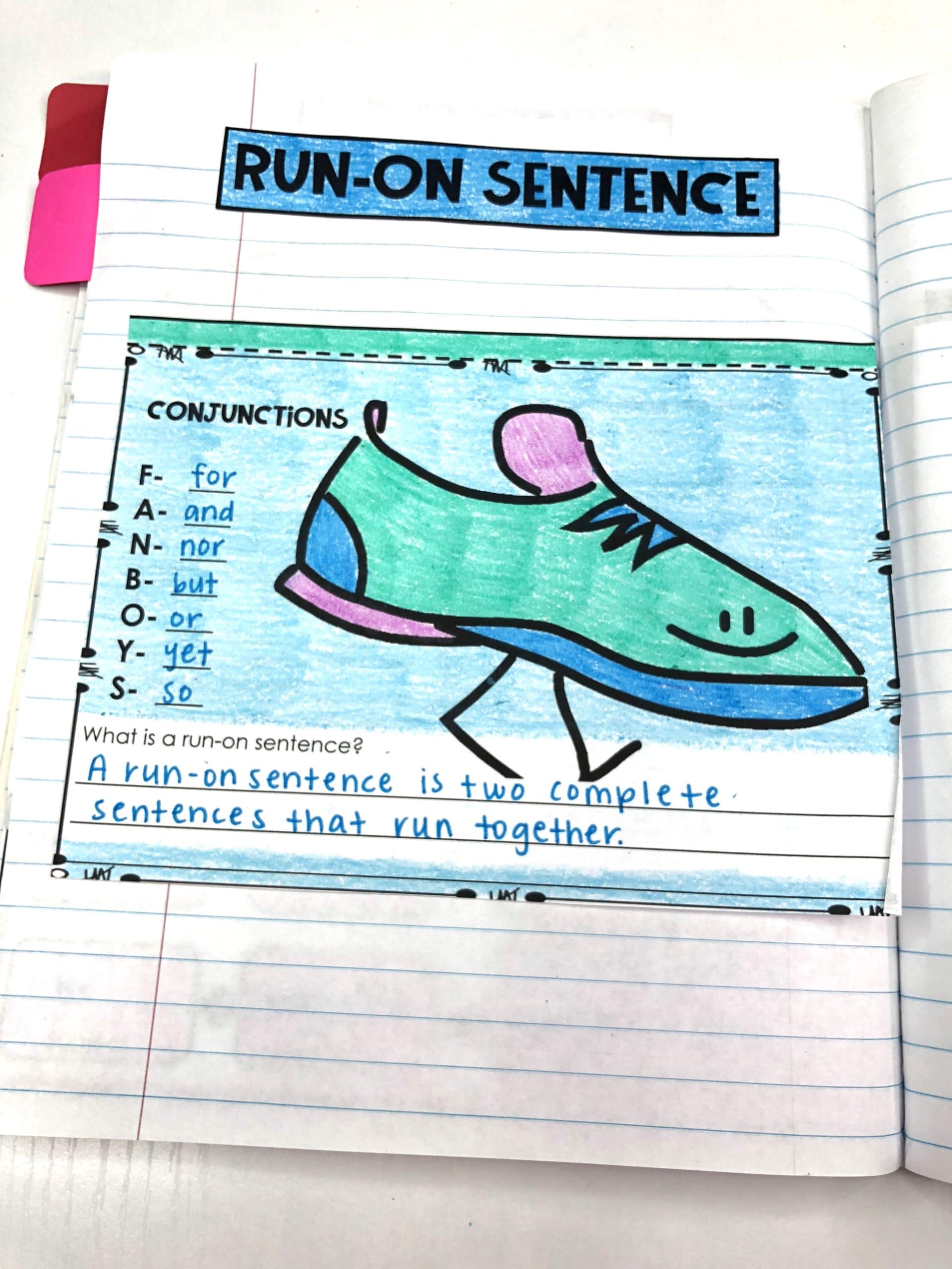 A RUN-ON SENTENCE is two complete sentences that run together. Use visuals of a running shoe to begin this lesson. Tell students they need to SLOW DOWN and fix the run-on sentences. Use this anchor chart to help explain the lesson.