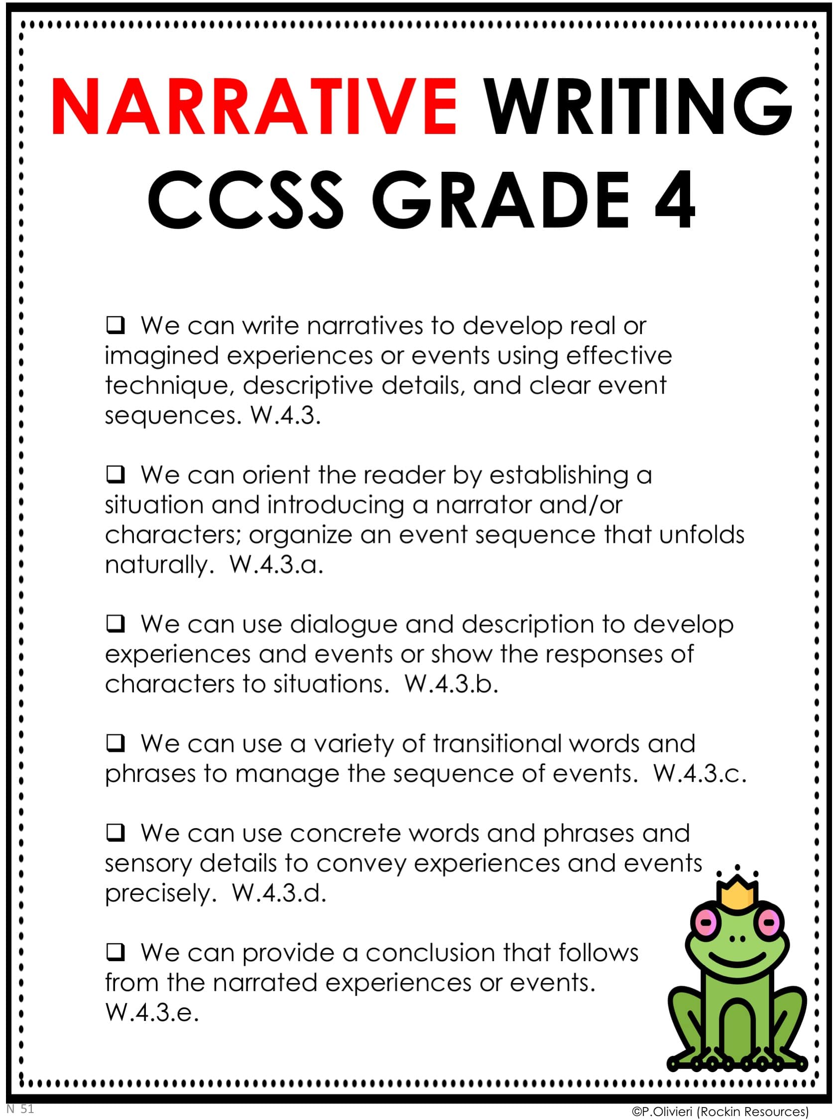 You may also review your standards for narrative writing and inform students that they will accomplish all of the standards throughout the narrative unit. This is a sample of Common Core Standards for Narrative Writing. I like to give students a copy of the standards to check off as they complete each one.