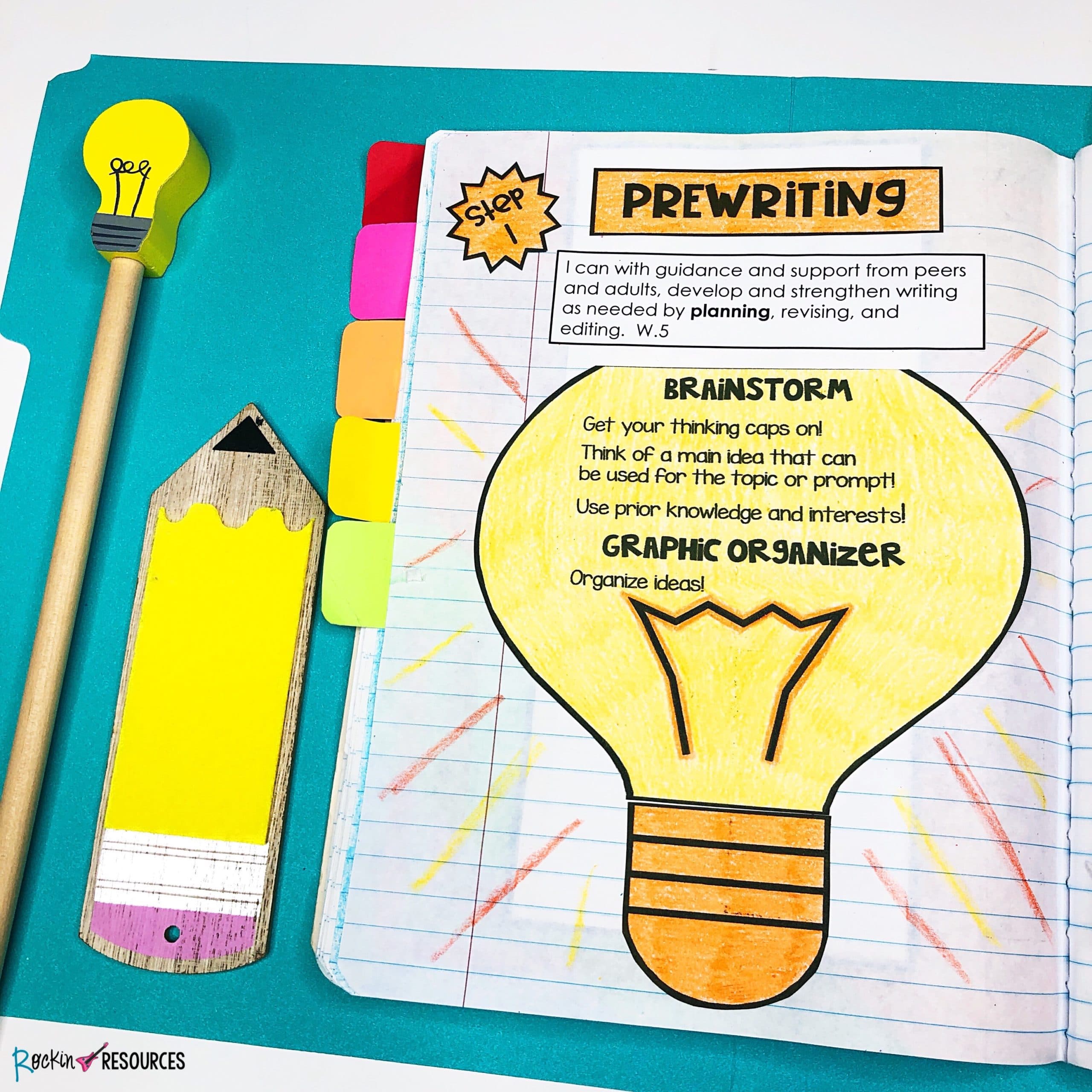 Have students write ideas for their stories and choose one. This is an example from the interactive writing notebooks. Students write their ideas on the front of the light bulb. Then lift the light bulb and choose one that they will use! When using interactive notebooks, I allow students to get creative. If they want to do theirs differently, go for it! They will take more ownership!