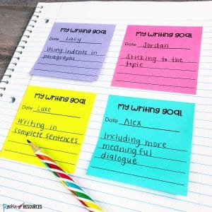Tell students to think of something that they frequently have to correct in their writing or something that they find difficult when writing in the past. Explain that writing goals can change from one piece of writing to the next. I find it best for students to focus on ONE goal in each writing piece.