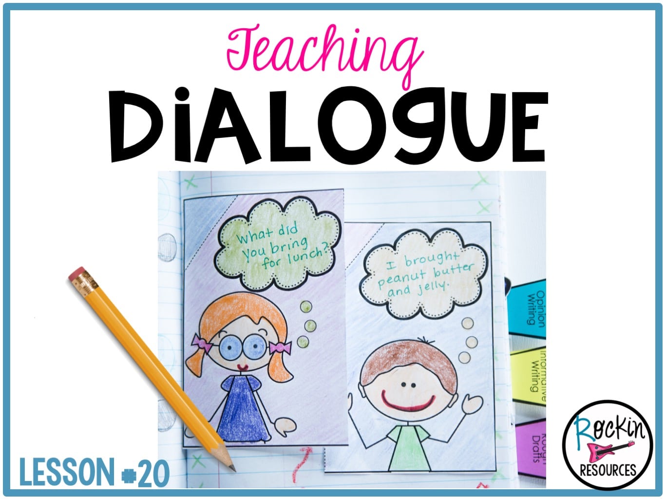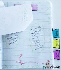 Taking notes on how to write dialogue will help students remember the lesson as well as give them a resource to refer back to when writing. This interactive writing notebook page uses speech bubbles to give example of dialogue and flip open to take notes. You may also use MINI WRITING ANCHOR CHARTS to paste in notebooks if you don’t have time for interactive writing notebooks.