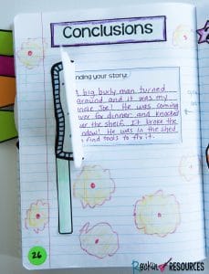 After students have the background knowledge, modeled samples, and practice, they are ready to apply their knowledge! This is an example of an interactive writing notebook page where students write the end of their story inside a finish line flag. Then students should transfer that conclusion onto their graphic organizer for the story.