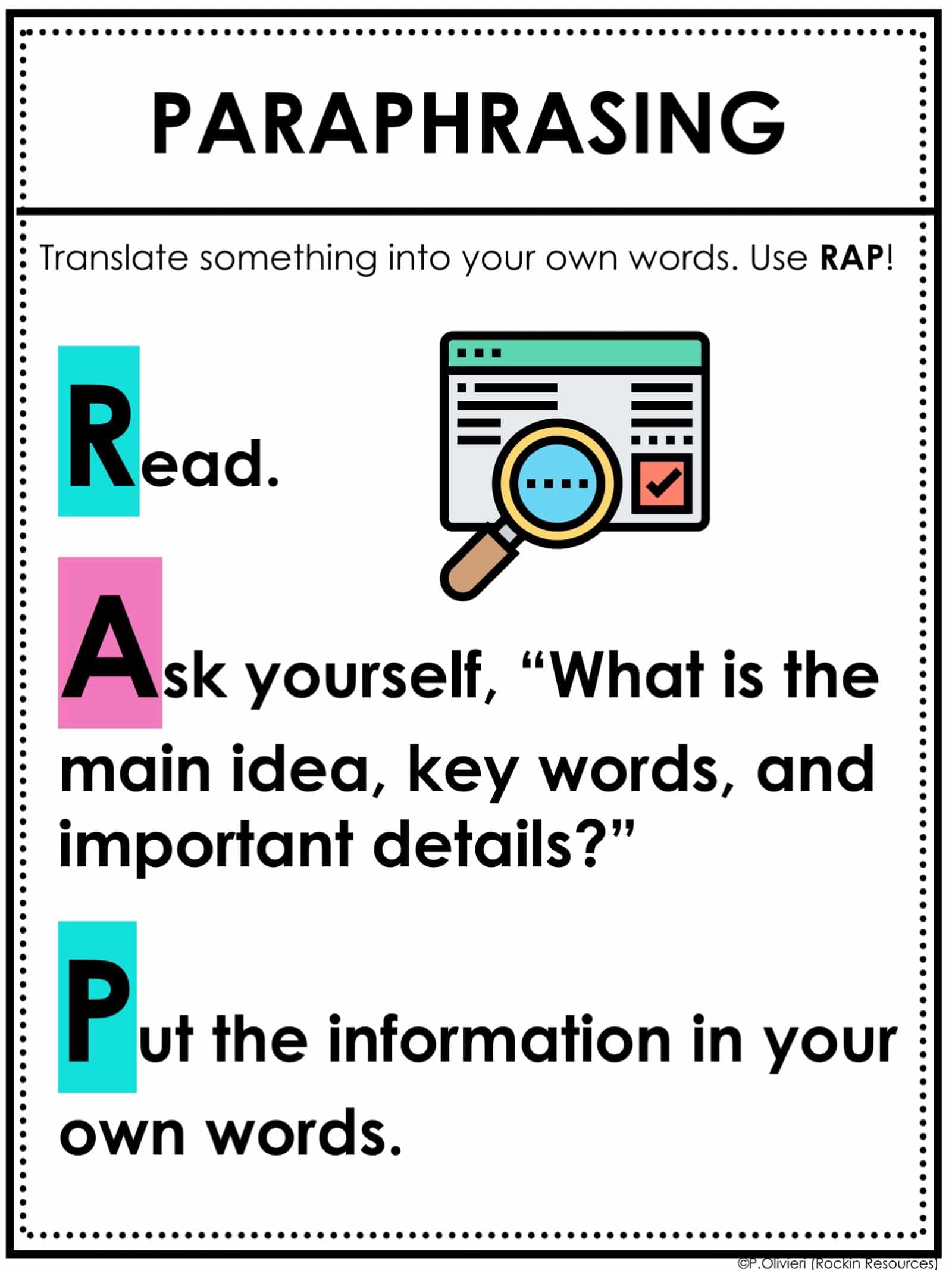 Paraphrasing: The author explains…. The text shows…… Use RAP: Read, Ask yourself questions, Put the information in your own words.