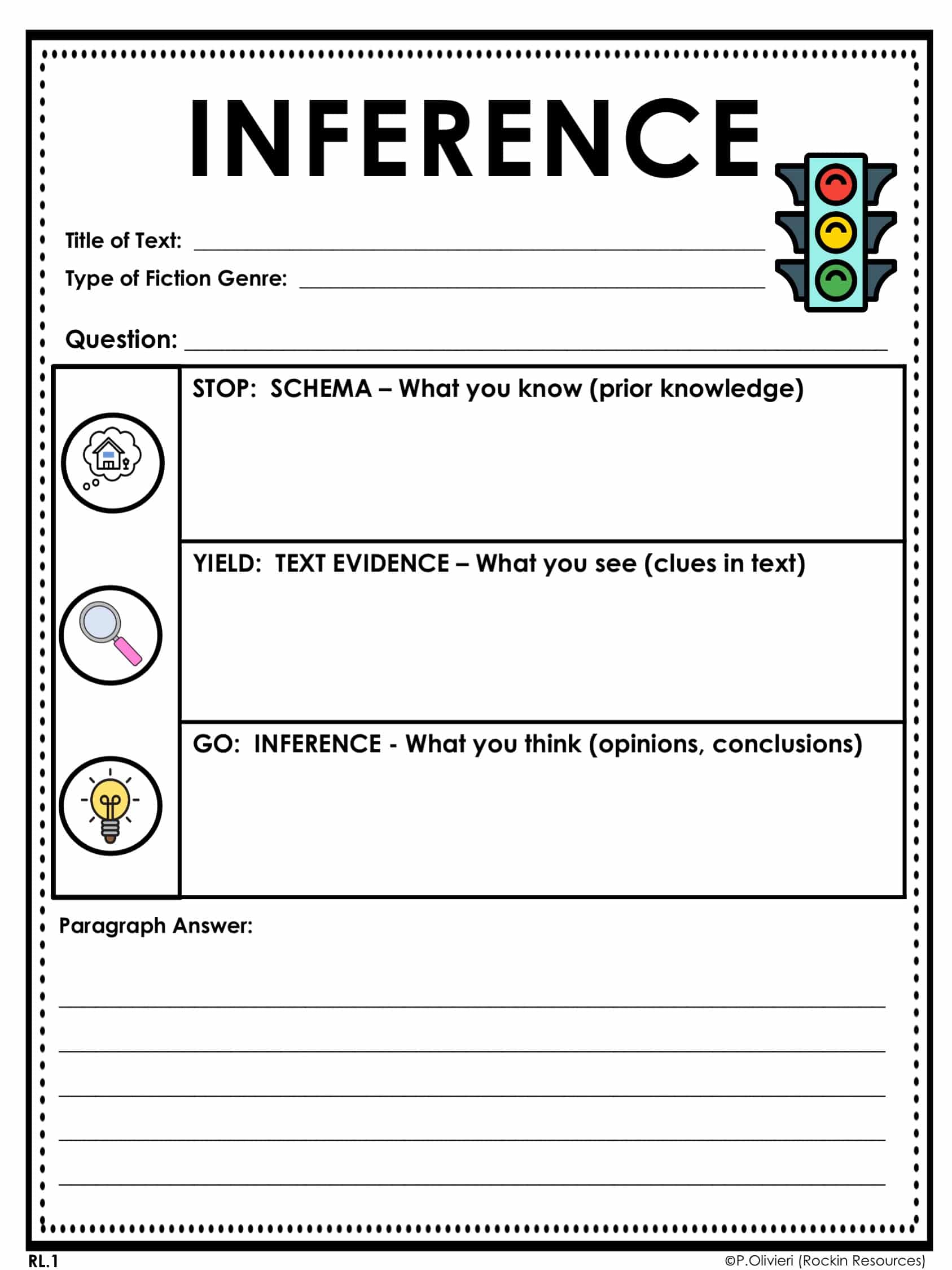 Making inferences while reading is a strategy that will help you understand the text at a deeper level. With the stop light, tell students that a yellow light comes before the red light. Many times they will need to do this step first (finding evidence in the text.)