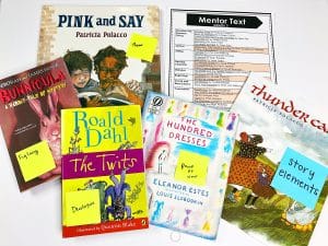 A mentor text is showing the skill in action. It shows the craft of a published author. Look on your library shelf. In any published children’s book, you will see some kind, if not numerous reading and writing skills. You can teach writing skills by showing students simple things like complete sentences, indents, and dialogue to more difficult skills like character development, word choice, and variety of sentences. You can teach reading skills by talking outloud on how to find them. What are the story elements, topic, or theme in the story? The above suggested mentor text list comes from one of my grade-level writing bundles. I like to provide my teachers with different books for each grade level so not every grade level is using the same list. It gives the students a variety of practicing the same skills throughout the years. Consistency is key! Show them mentor text of the same skill year after year! I’m also developing Amazon lists so you can see my suggestions. Some ideas are using Bunnicula to teach figurative language, Ramona the Brave for dialogue, Thundercake for story elements and crafting a title, and Pink and Say for theme.