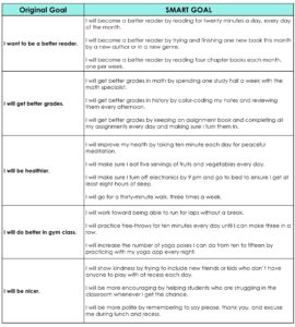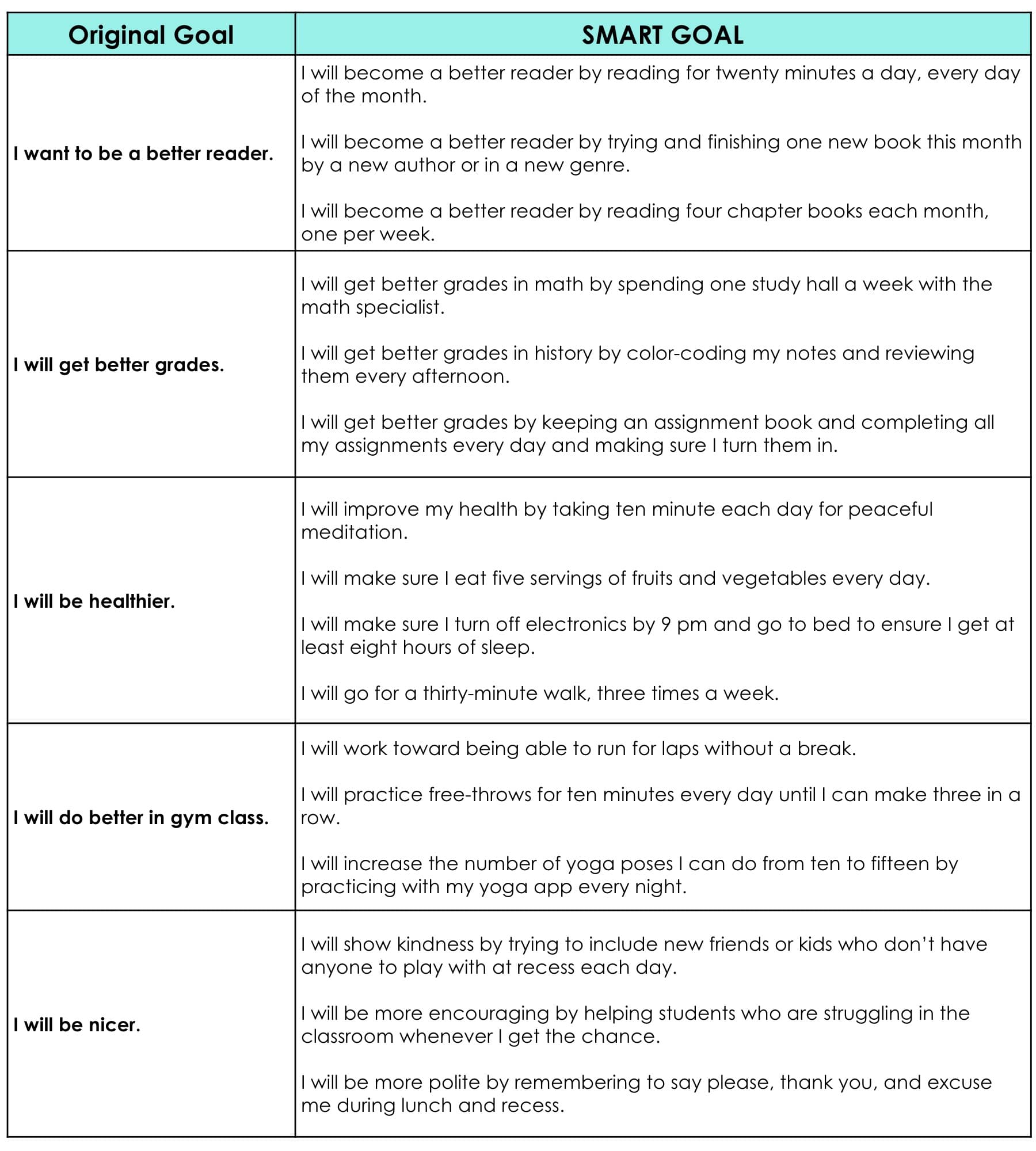 If your students are drawing a blank, here are some common goals that have been rewritten to utilize SMART goal-setting.