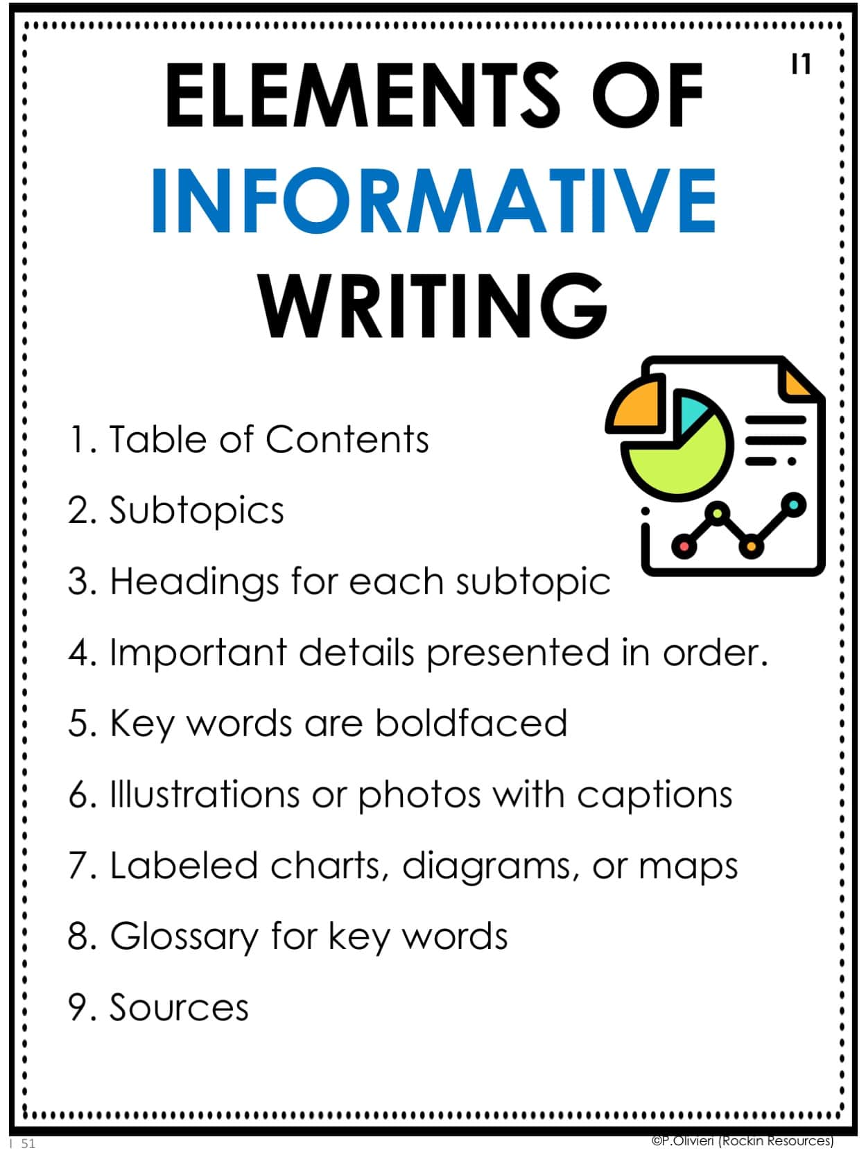 Informative Writings are similar to lab reports, in which a scientist writes and presents their findings to inform the reader of the experiment. Informative pieces have technical layouts which include a table of contents to aid the reader in finding specific topics, subtopics, glossaries, and works cited pages. Whereas Narrative writings are organized chronologically to depict a plot and storyline, Informative pieces are organized according to how the author wants to present important details about the subject. Illustrations, charts, diagrams, and maps are all useful visuals to reinforce data within Informative writing.