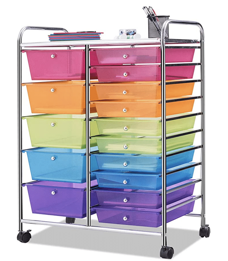 These drawers do wonders for classroom organization and they’re one of my favorite organization hacks of all time! I label them with the days of the week and then fill each of them up with that day’s corresponding worksheets, plans, and books. (Get the first week of lessons plans HERE) Any extra drawers can be used for future lessons or extra lessons, too!