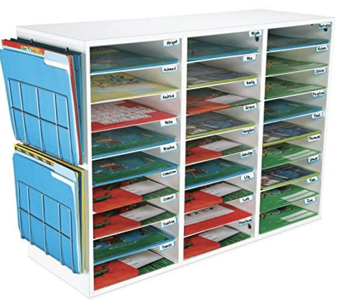This mail center works wonders in the classroom! In alphabetical order, each student is assigned a number that corresponds with their own “mailbox”. Students turn their assignments in their numbered mail slots, which makes it really easy for me to figure out who has/hasn’t turned in their work! I collect their work in order, which helps speed up the process of entering grades into the gradebook, too! For example, when I collect WEEKLY READING LOGS on Fridays, I could quickly see who still needs to turn one in!