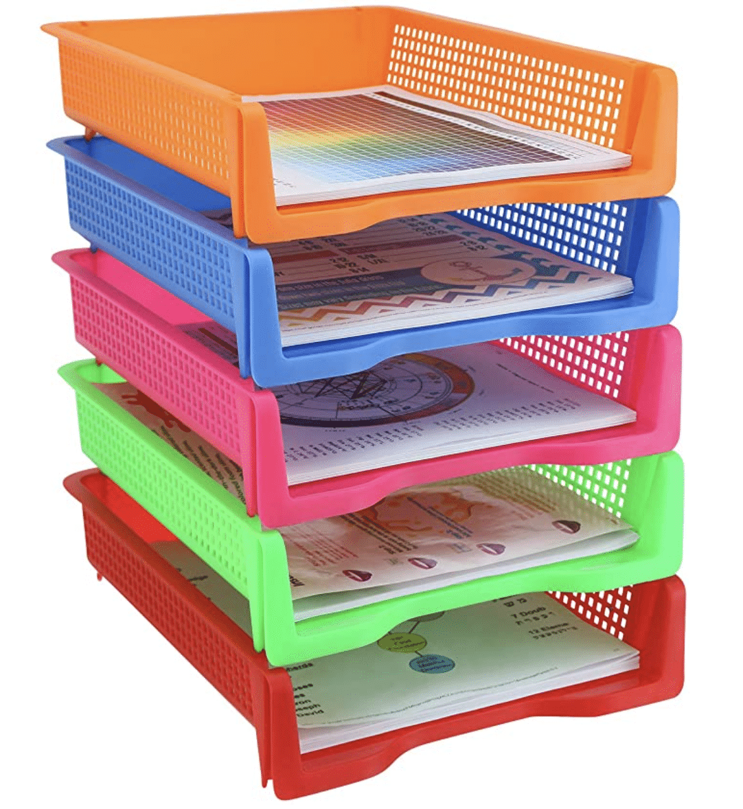 I use these stackable trays to house students’ completed work assignments after I gather them from the mail center. Actually, one of my classroom jobs was for a student to collect items from the mail center! You can also use a separate tray to keep track of work for absent students!