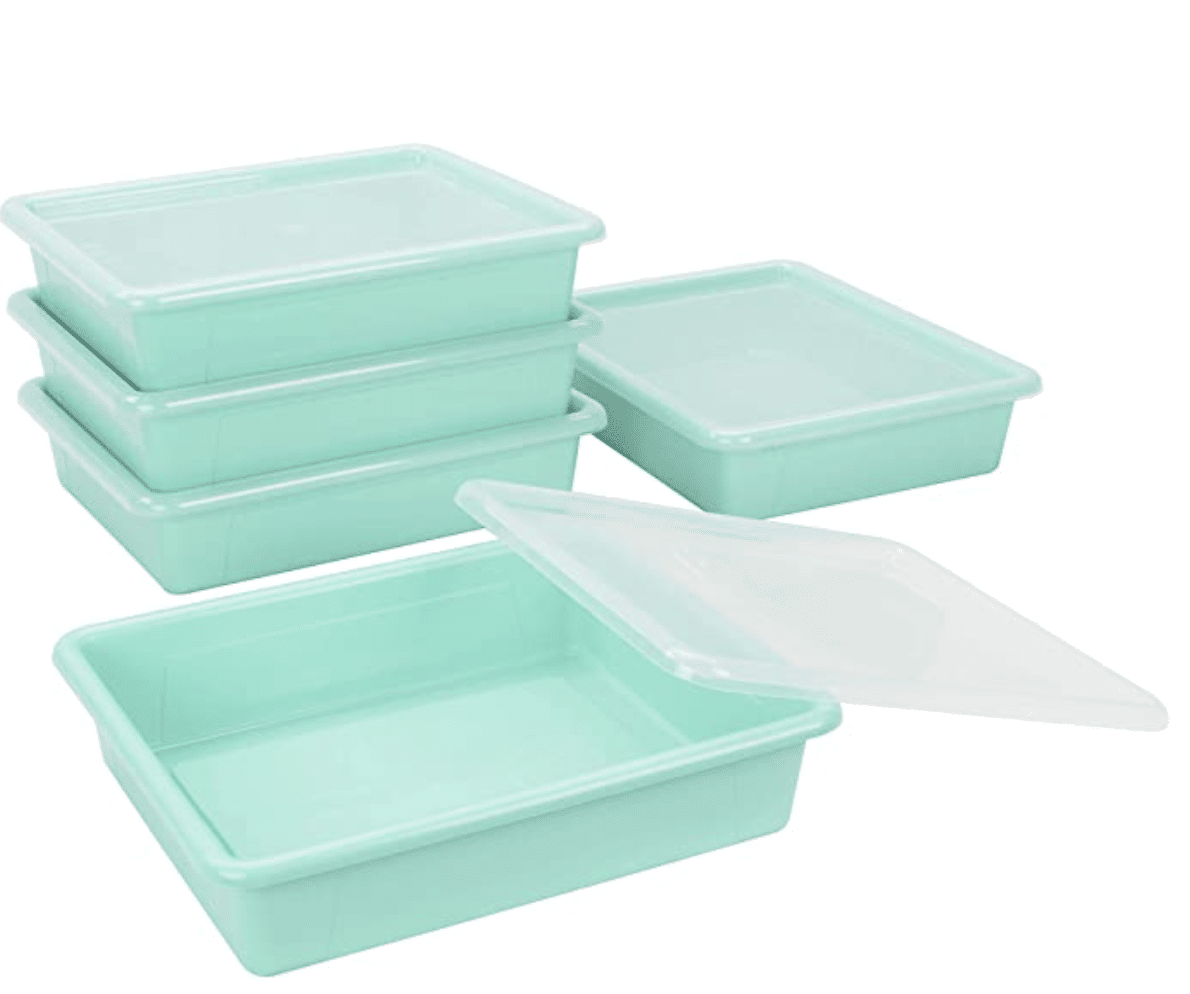 These storage bins are fantastic for storing art projects and craft supplies. They’re larger than letter-size and they come with lids! If you are working with students who use manipulatives to meet goals on their IEPs, these also pair wonderfully with the Drawers for Daily Plans mentioned above, enabling you to organize bulkier activities that correspond with each student’s lesson plan for the day.
