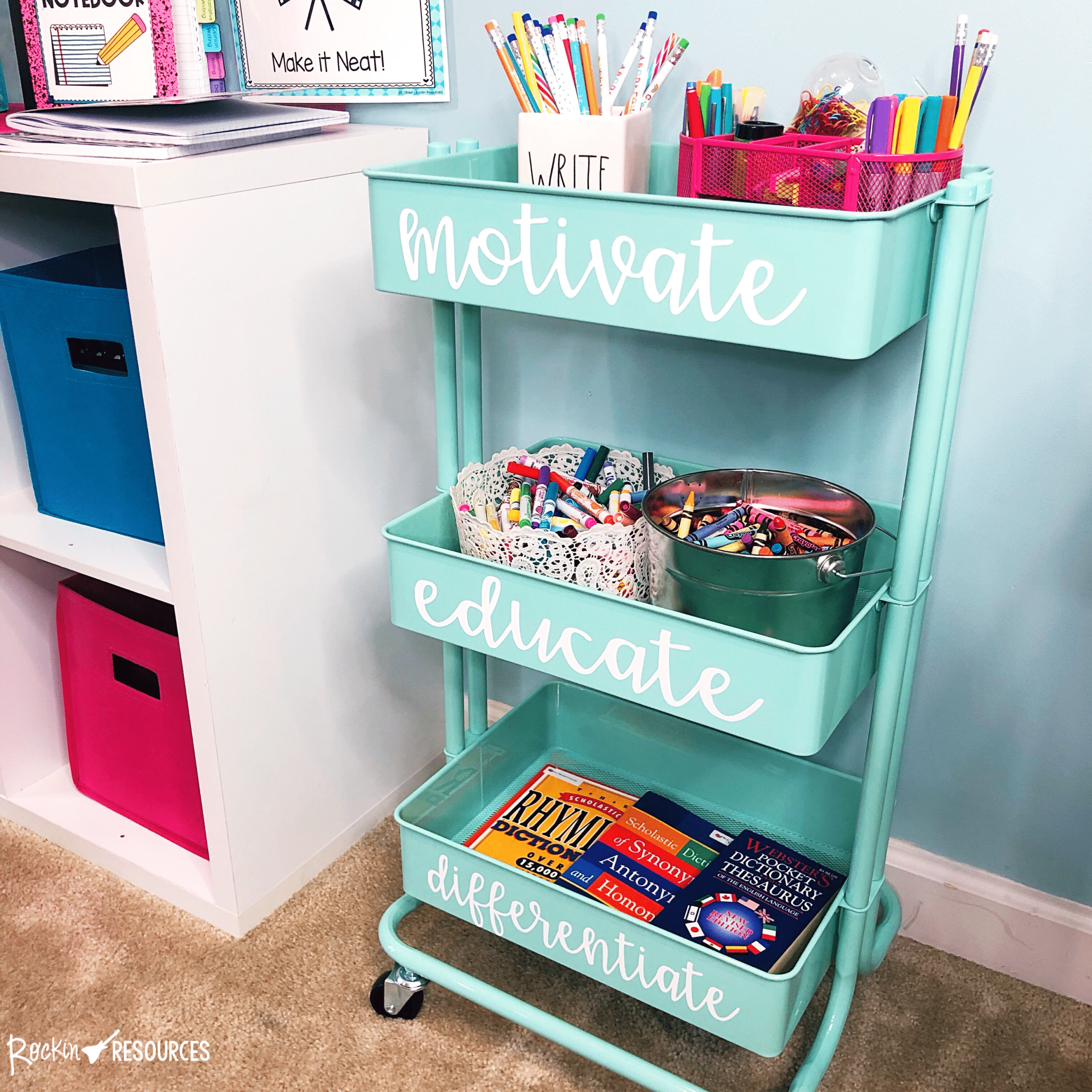 I love using supply carts and caddies in the classroom to organize everything from thesauruses and dictionaries to crayons and pencils. The rolling supply carts are perfect for an active classroom that moves around a lot, and they can fit a good deal of supplies throughout the three tiers. They can be placed in centers (especially writing centers), in groups, or even behind the teacher’s desk.