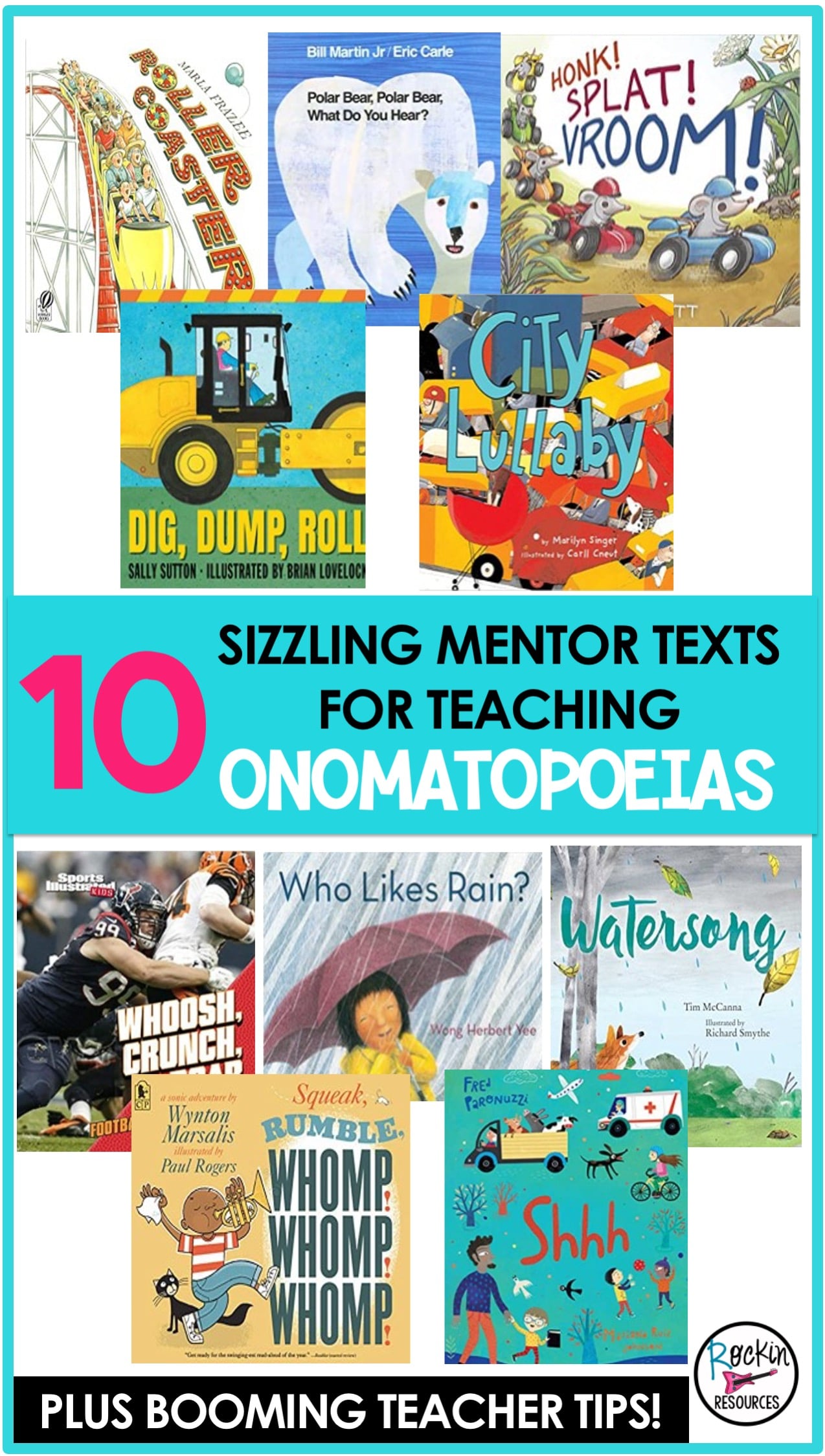 Teaching onomatopoeias just got more fun with these mentor texts that feature a variety of human-made and natural sounds. From city streets to nature scenes, students will be entertained by this writing element that involves both visual and auditory senses. Read on for 10 SIZZLING MENTOR TEXTS FOR TEACHING ONOMATOPOEIAS plus some BOOMING teacher tips!