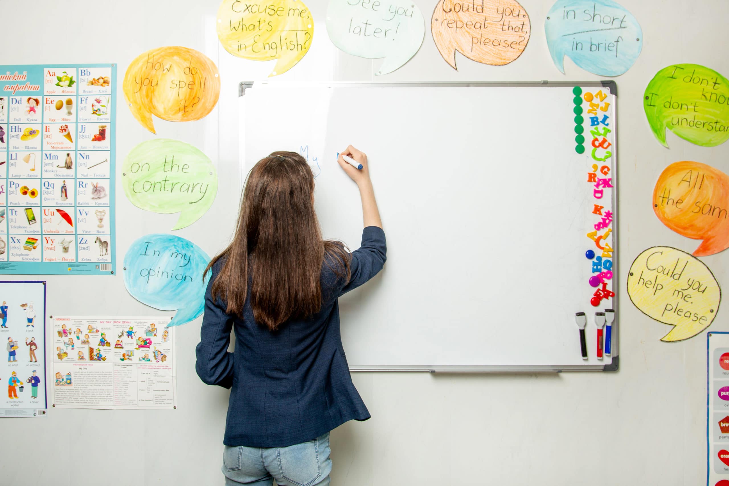 girl writes in English on the blackboard. girl stands near the c