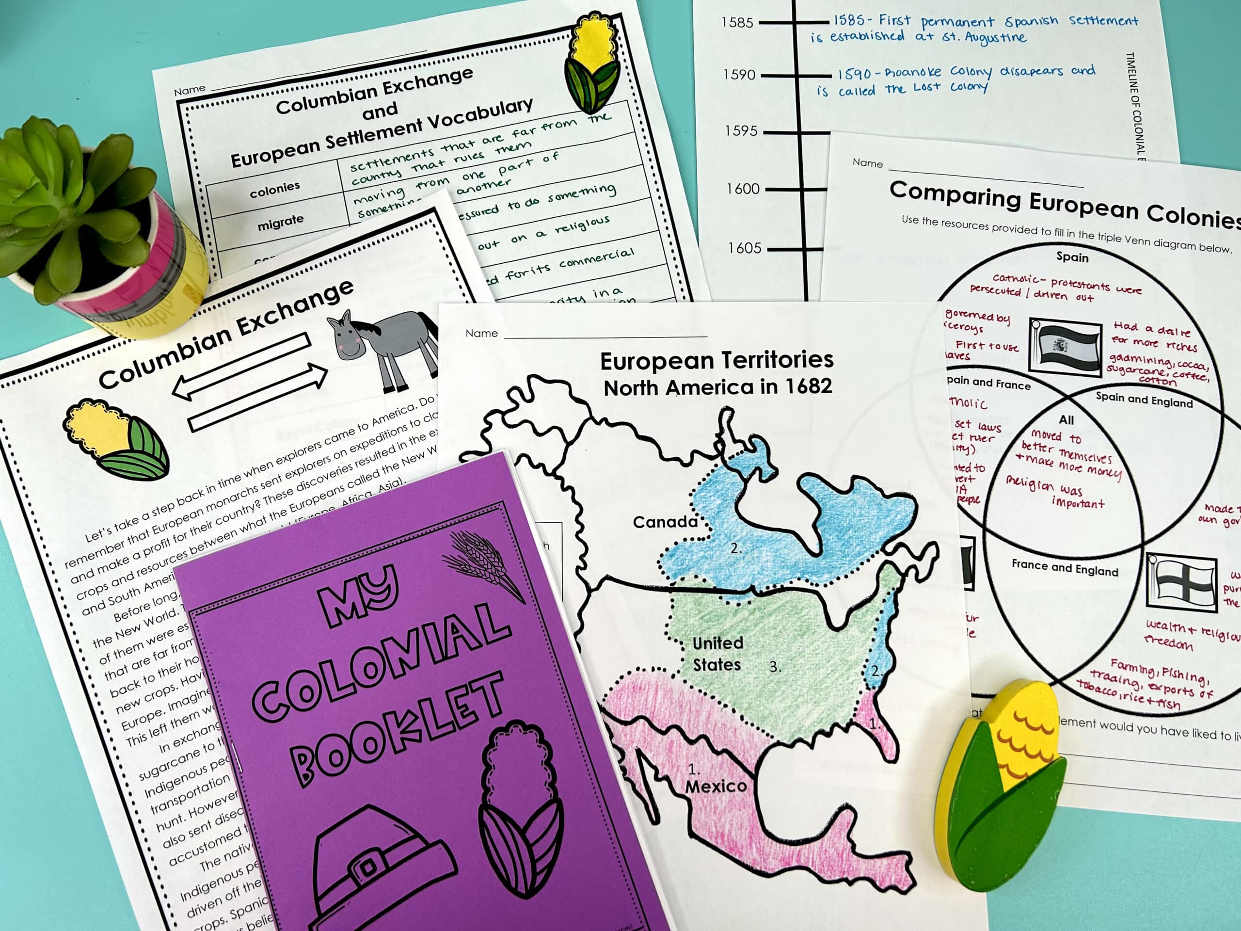 Once Europeans settled on American soil, how did they claim land? What was it like? The answers are in this comprehensive colonial unit that includes all the informational text needed to teach colonization in your classroom. There are graphic organizers, maps, comprehension questions, cause and effect activities, vocabulary, as well as craft and food ideas.