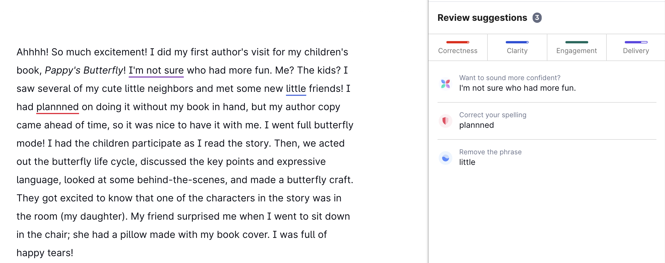 - Clarity-focused sentence rewrites: Get suggestions to make your sentences clearer and more concise.