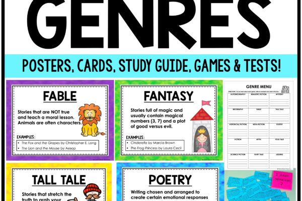 Genre Anchor Charts, Notebook Cards, Study Guide and Test