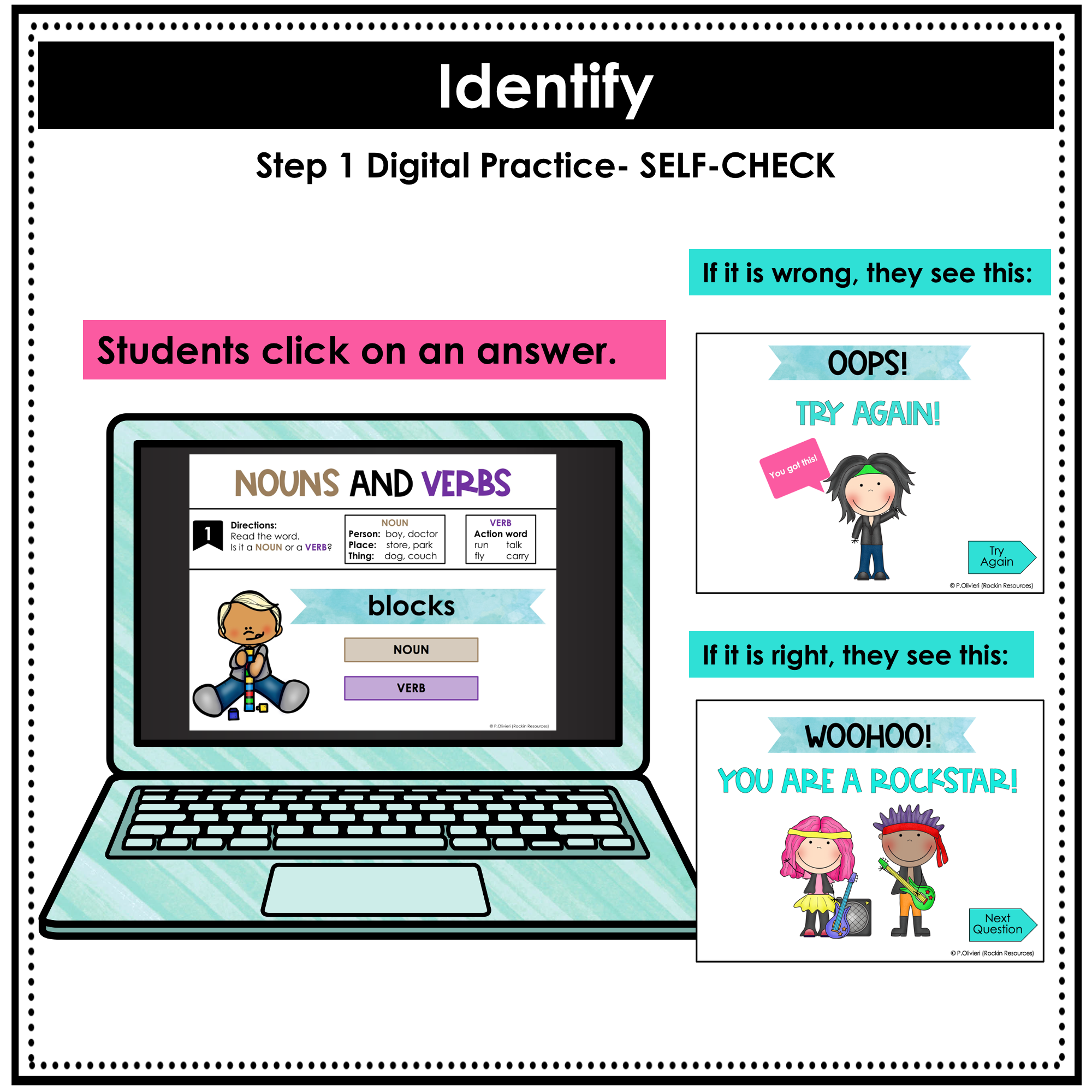 1. Identify – Students identify whether the word is a NOUN or a VERB. This is a self-check activity.