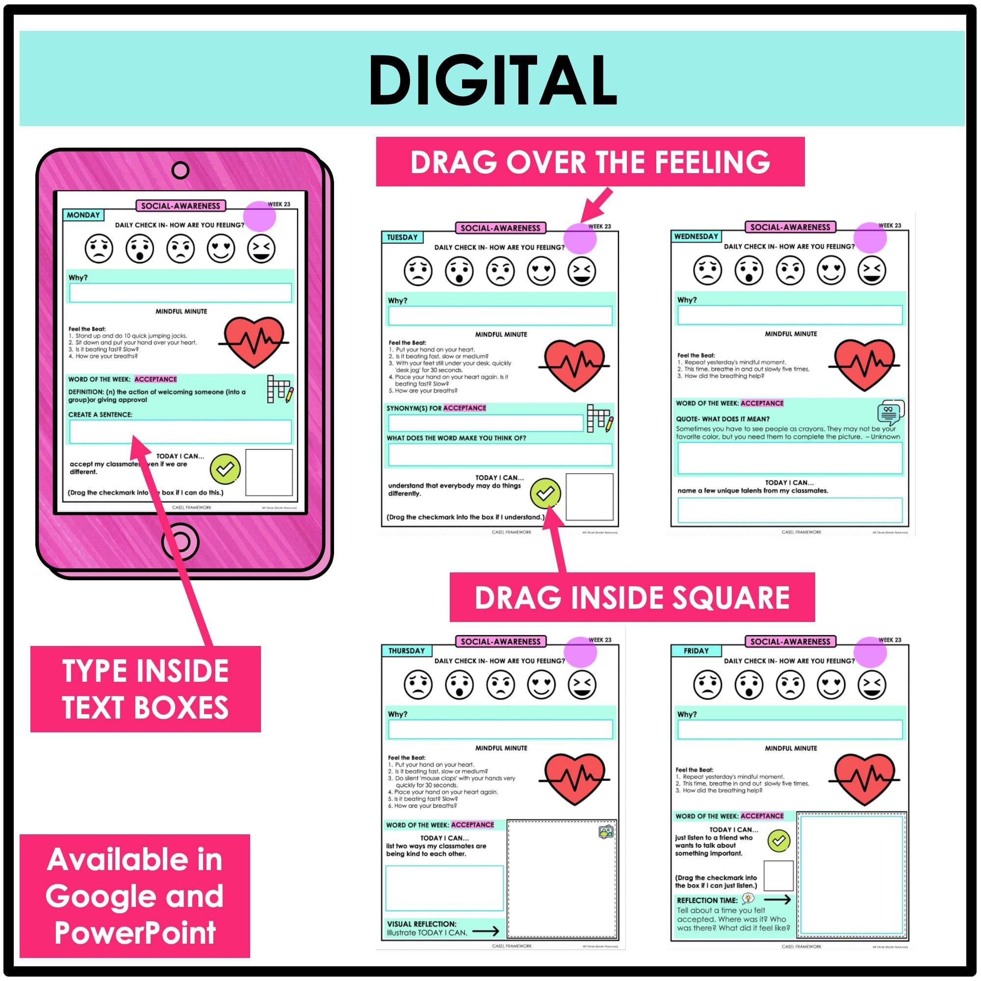 This SOCIAL EMOTIONAL LEARNING journal with Casel Framework covers all 5 CASEL COMPETENCIES. To take students confidently through the school year, each of the 5 competencies are scaffolded and repeated 7 times to provide 35 weeks of social emotional learning opportunities. It is perfect for morning work to start off the day on the right foot! DIGITAL NOW AVAILABLE- PDF, GOOGLE, AND POWERPOINT INCLUDED!