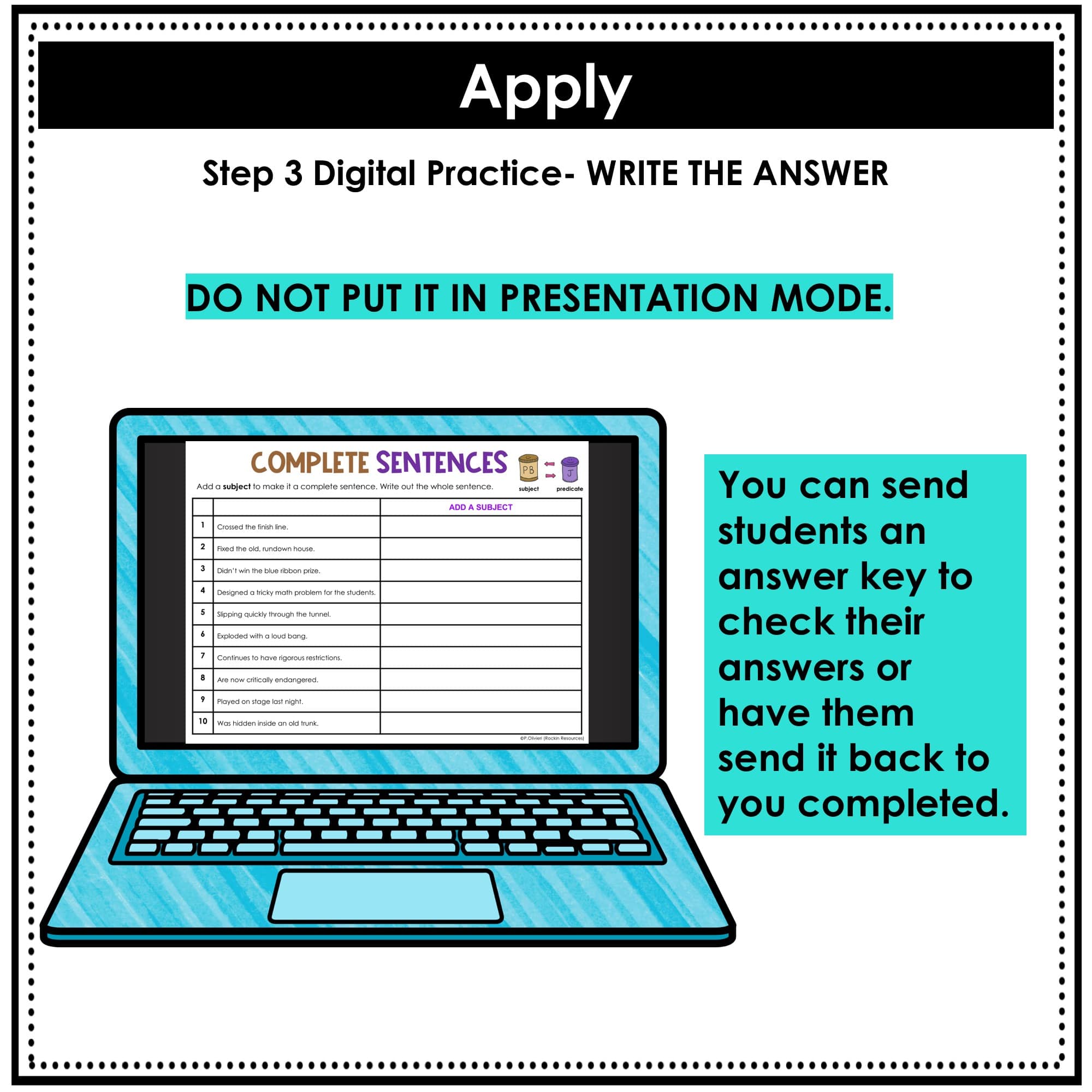 3. Apply– Students write in complete sentences adding a subject or predicate. Students then send the answers to you.