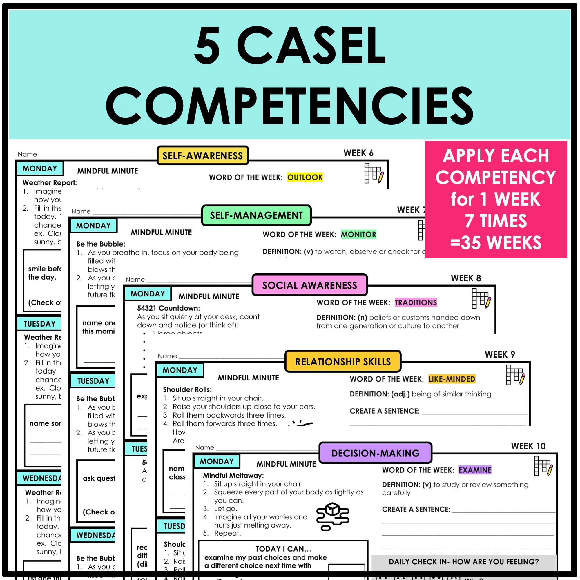 This SOCIAL EMOTIONAL LEARNING journal with Casel Framework covers all 5 CASEL COMPETENCIES. To take students confidently through the school year, each of the 5 competencies are scaffolded and repeated 7 times to provide 35 weeks of social emotional learning opportunities. It is perfect for morning work to start off the day on the right foot! A DIGITAL VERSION IS COMING SOON AND WILL BE INCLUDED!