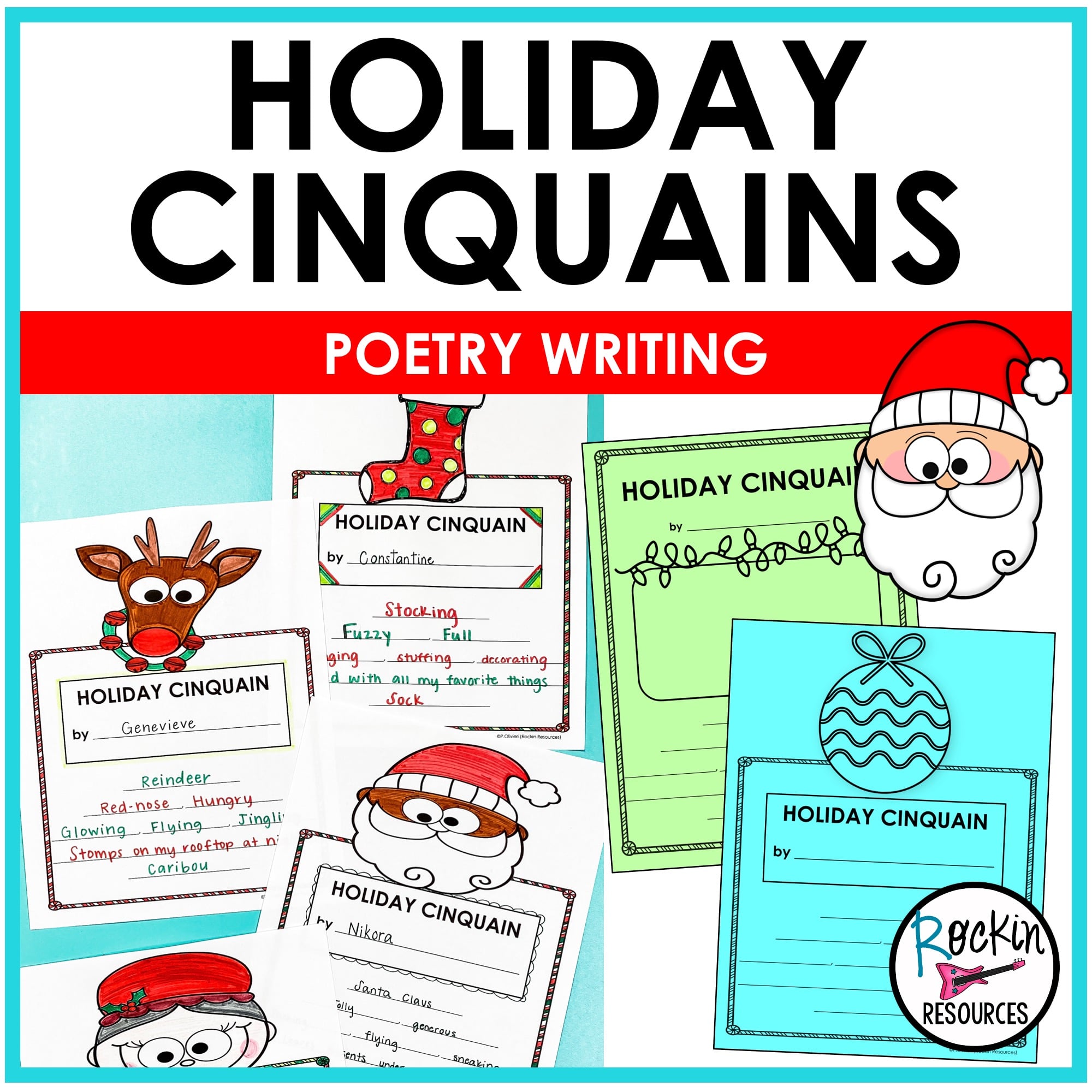2. Templates to write the cinquain. There are 14 total templates. (13 of them have Holiday Cinquains written at the top along with different clipart. 1 has Christmas Cinquain written at the top.)