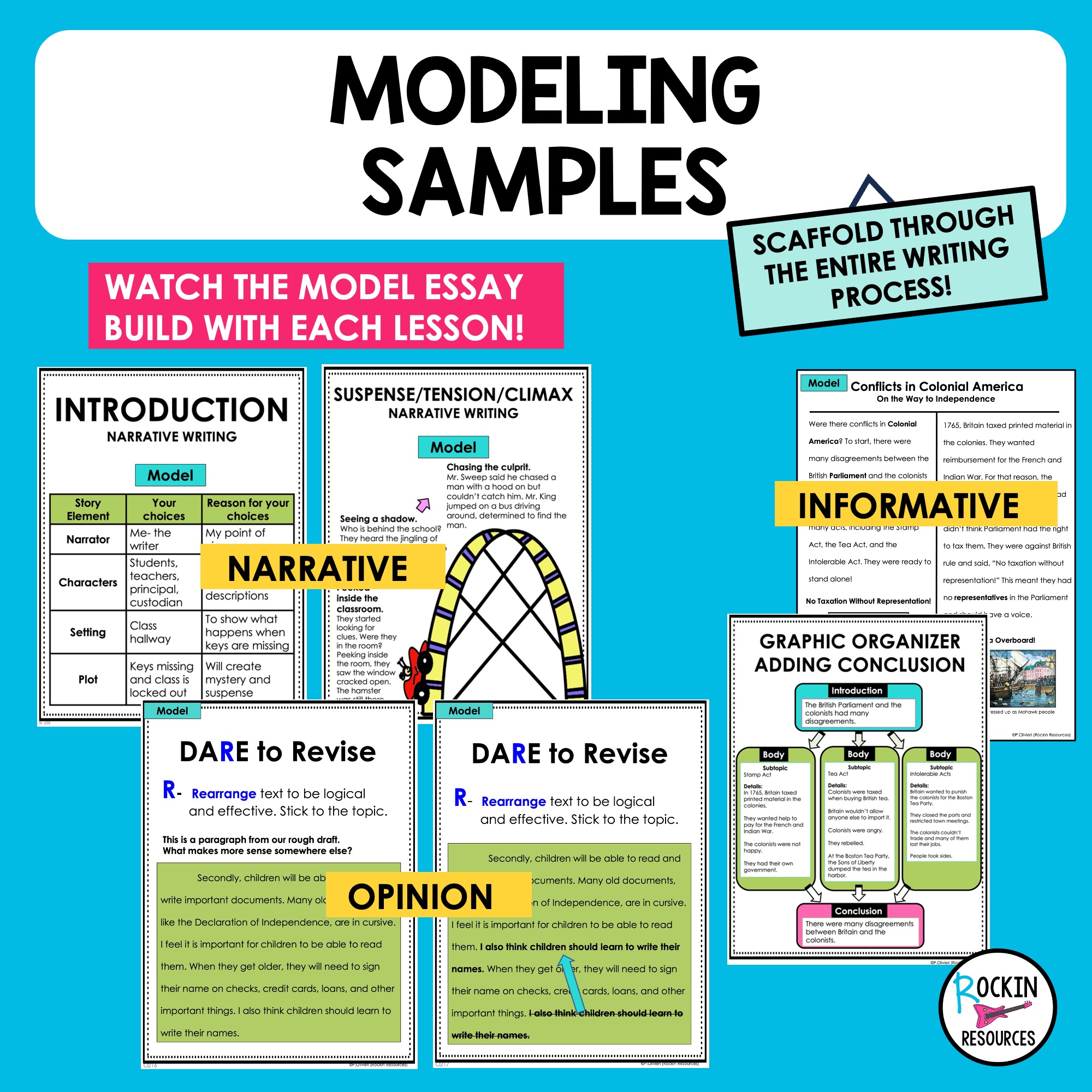 MINI-LESSONS: Informative elements, organizational structures, brainstorming, graphic organizers, determining task, purpose, audience, writing an introduction, body, and conclusion, how to take notes, avoid plagiarism, and cite credible sources, types of relevant facts, using graphics, headings, picture captions, table of contents and glossary, strategies to write a rough draft and writing goal, D.A.R.E. to Revise (Delete, Add details and transition words, Rearrange, Exchange for a strong lead, better keyword choice, sentence variety, strong conclusion), C.U.P.S. to Edit (Rules for Capitalization, Usage, Punctuation, Spelling), writing a title, peer reflection, and final copy strategies.