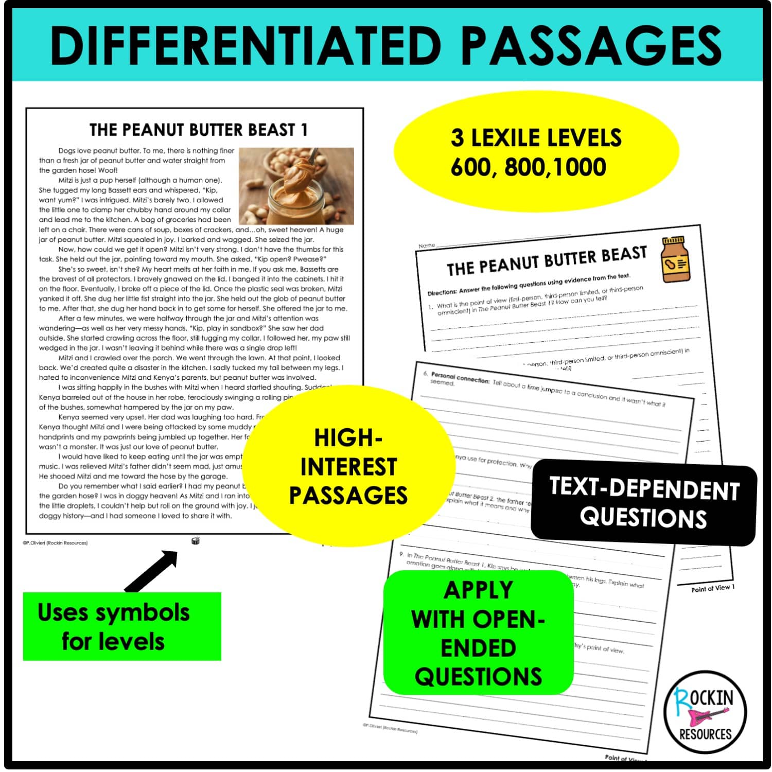 3. Differentiated Passages and Questions: 4 high-interest reading passages at 3 Lexile levels: 600 (lower level), 800 (mid-level), 1000 (higher level). Some passages are paired for comparison and contrast of perspectives. Use them for whole-group, small-group, and independent work and assessment.