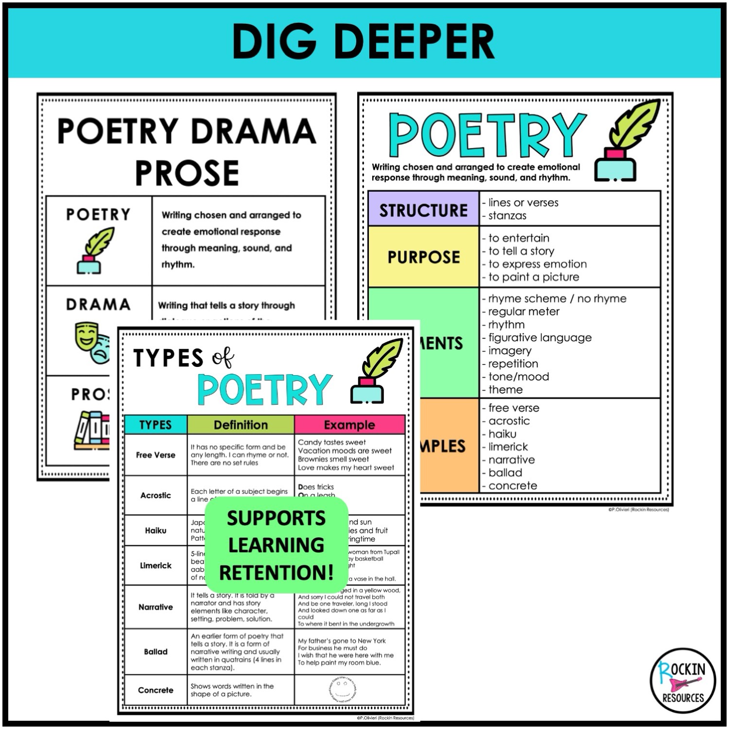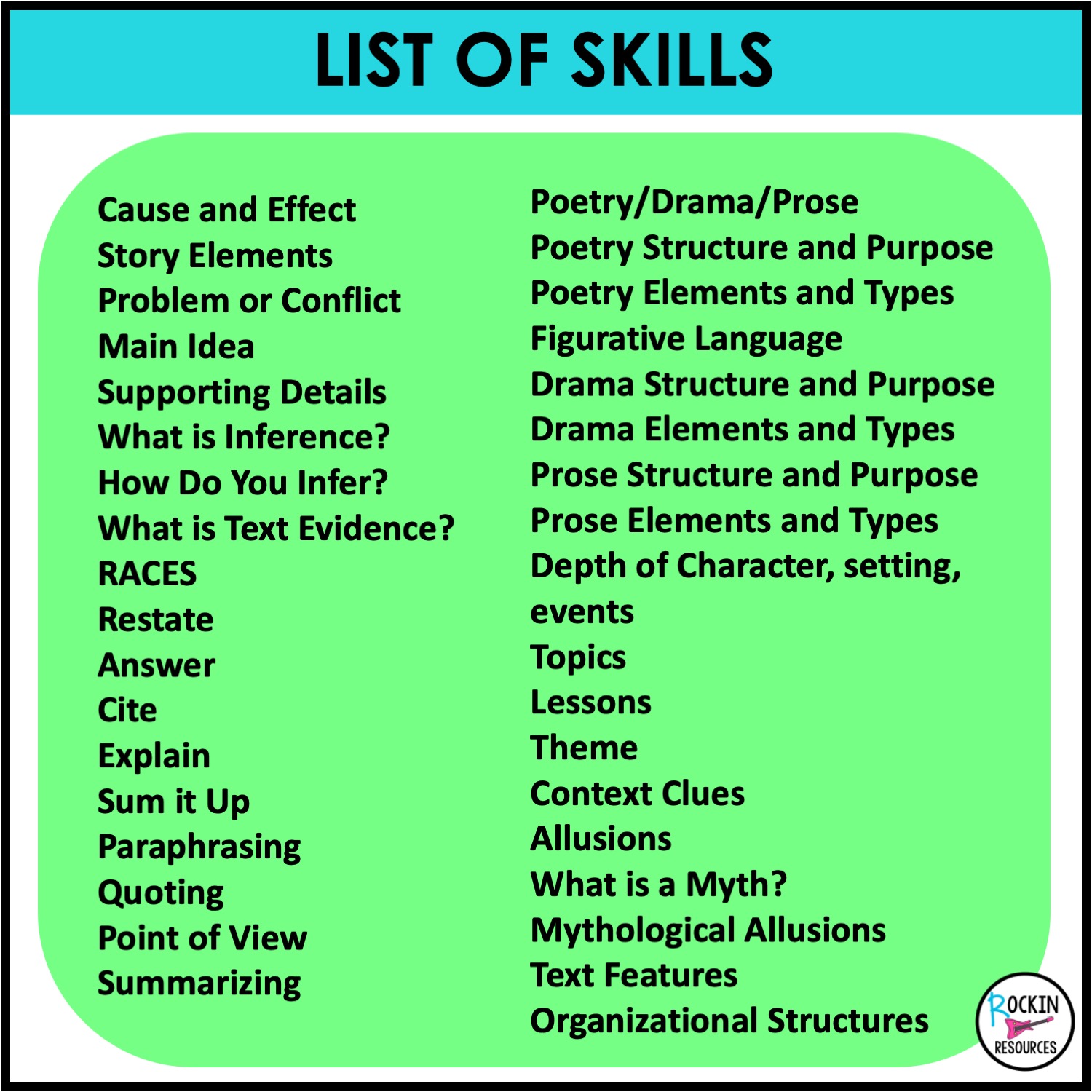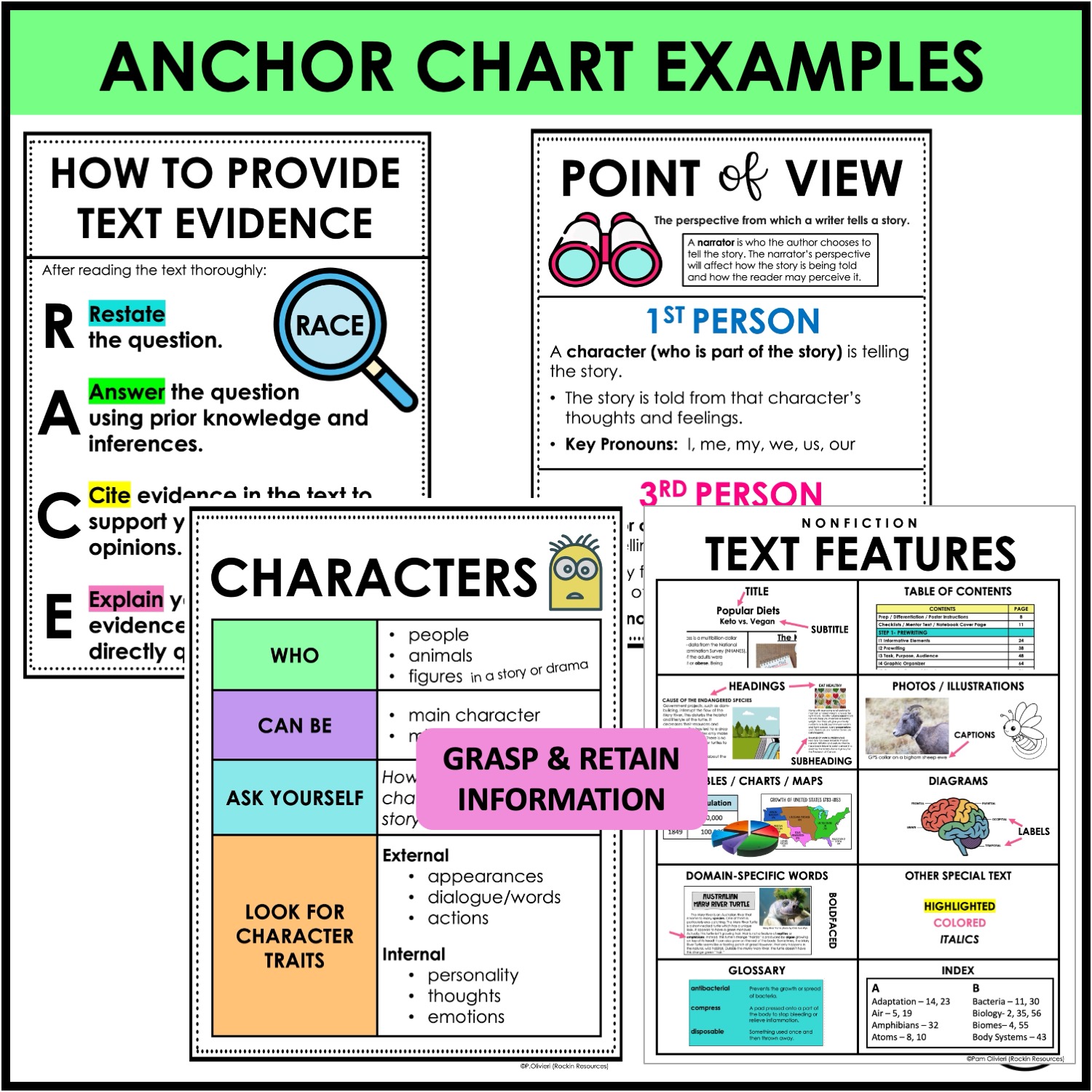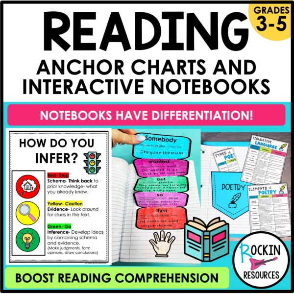 ✔ Teach the Skill – Introduce concepts like main idea, inference, text evidence (RACES), theme, context clues, point of view, poetry, drama, prose, text structures, and more using engaging full-size anchor charts.