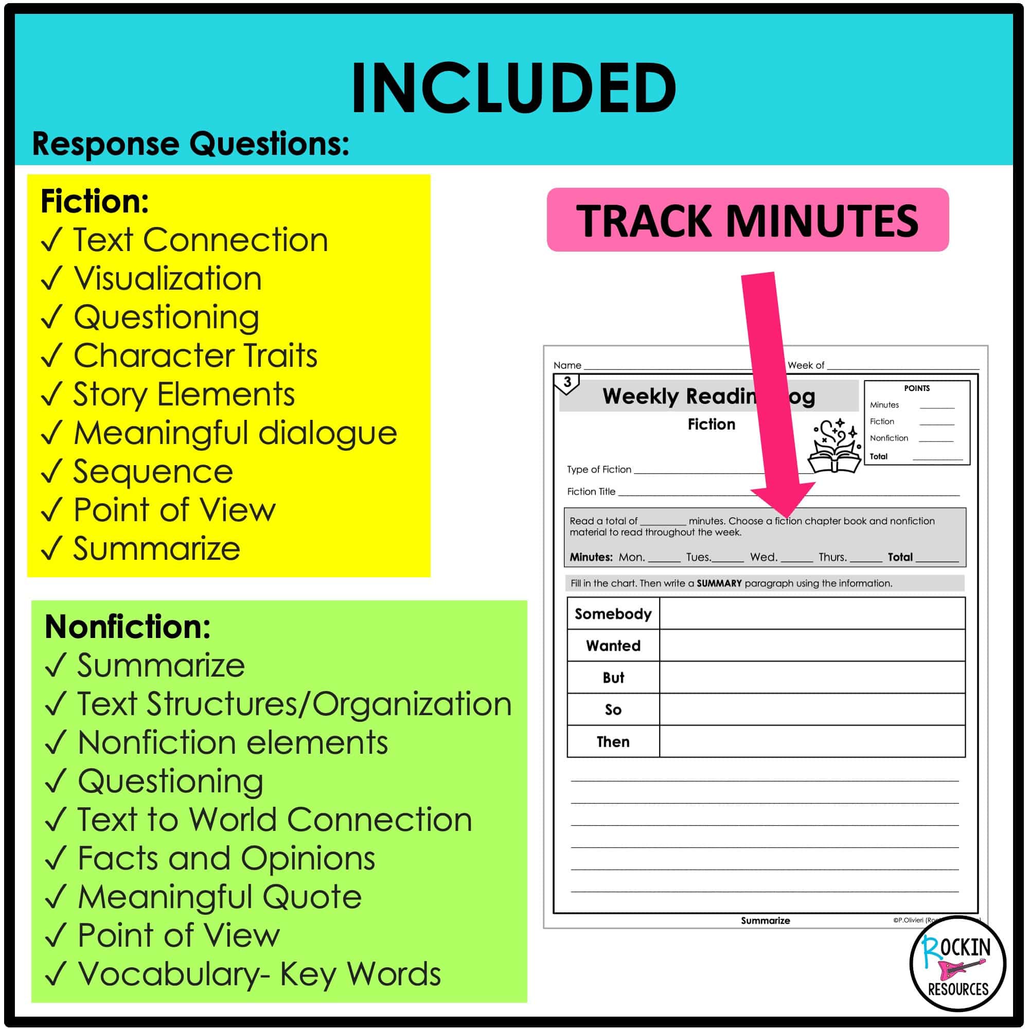 Each week, students are required to read a FICTION AND NONFICTION text and have specific response questions related to Common Core reading standards. Students record the minutes, genre, or book source, and write a response to their two readings to submit at the end of the week.