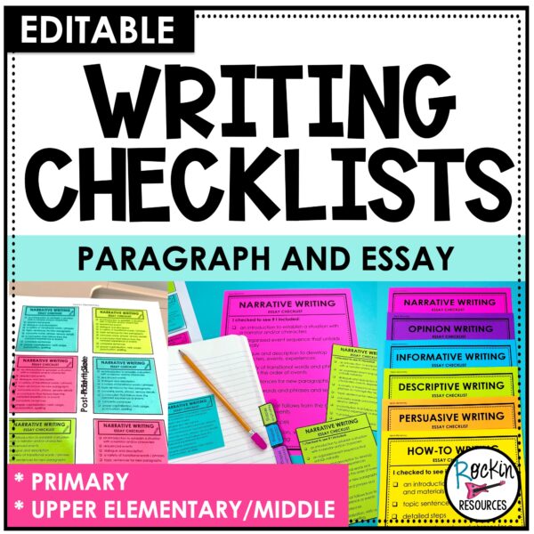 Newly revised with tons of UPDATES and Post-It templates! These writing checklists are ready to print and use today! They are completely editable. You will find writing checklists for paragraph and essay writing in the following types of writing: Narrative, Opinion, Informative, Descriptive, Persuasive, How-To.