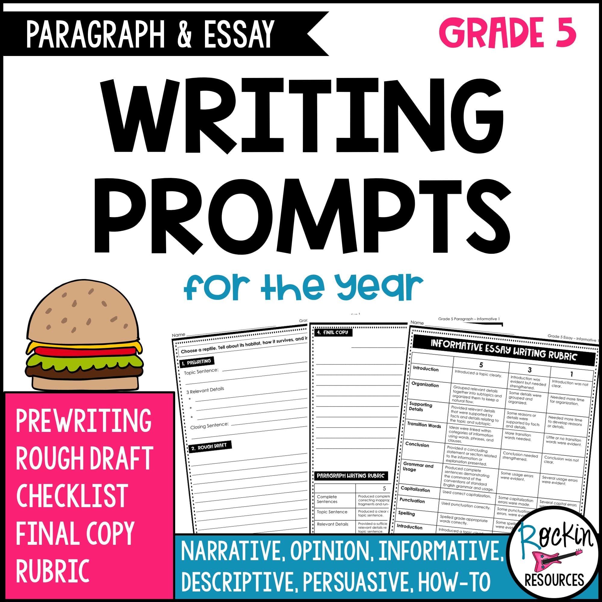 For each prompt, there are student printables for both paragraph and essay writing and each page is labeled with the grade, type of writing, and number of prompt for easy organization.